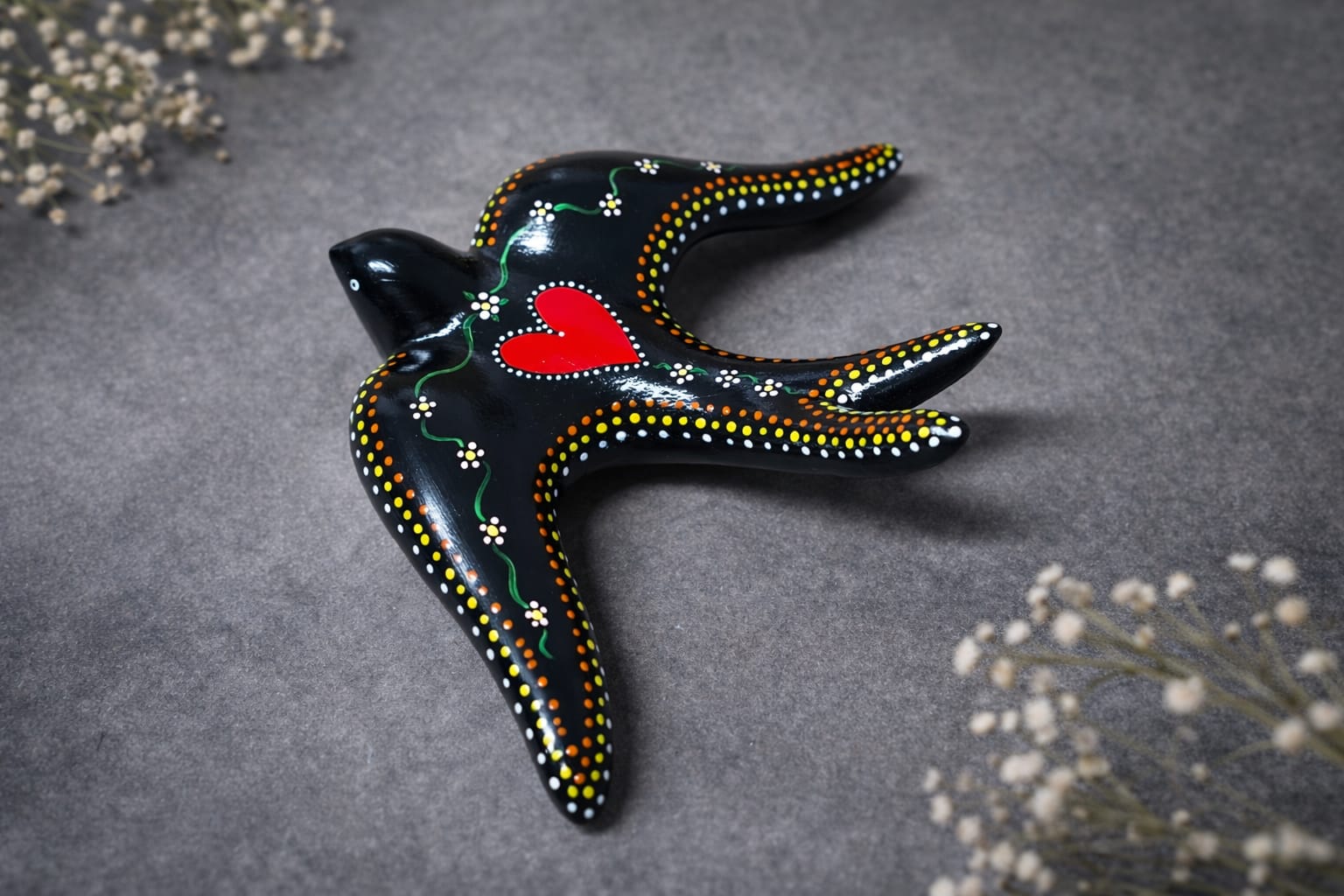 Andorinha grande em cerâmica, pintada à mão com cores inspiradas no tradicional Galo de Barcelos.