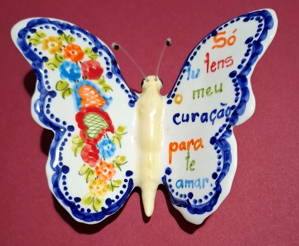 Borboleta para pendurar produzida em cerâmica vidrada e decorada à mão com os motivos dos lenços dos namorados de Vila Verde.